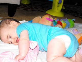 - She has really started noticing and interacting with Elle! She laughs like crazy and talks to her and smiles at her...she also grabs her hair, her tail and her eyeballs...good thing Elle is very patient and doesn't seem to mind!